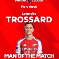 首开记录,英超官方:特罗萨德当选阿森纳1-1埃弗顿球迷票选最佳